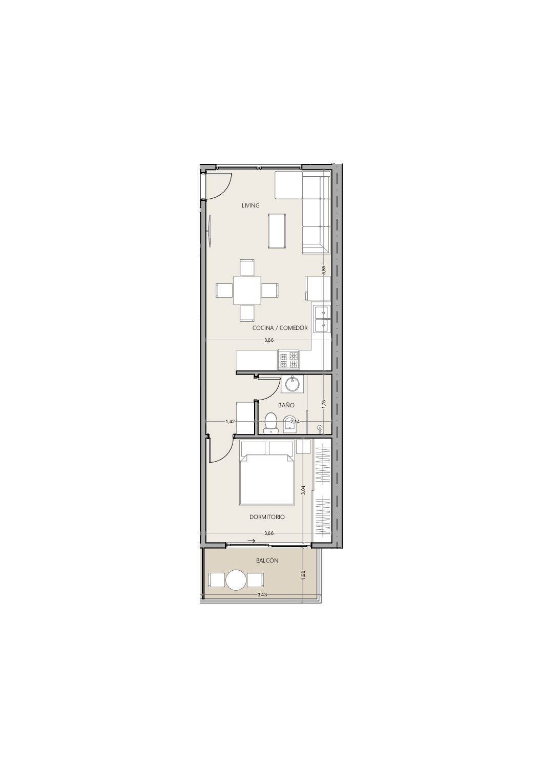 1 dormitorio en segundo piso con balcón al frente, 1 dormitorio, cocina-living y comedor integrado, 1 baño completo.