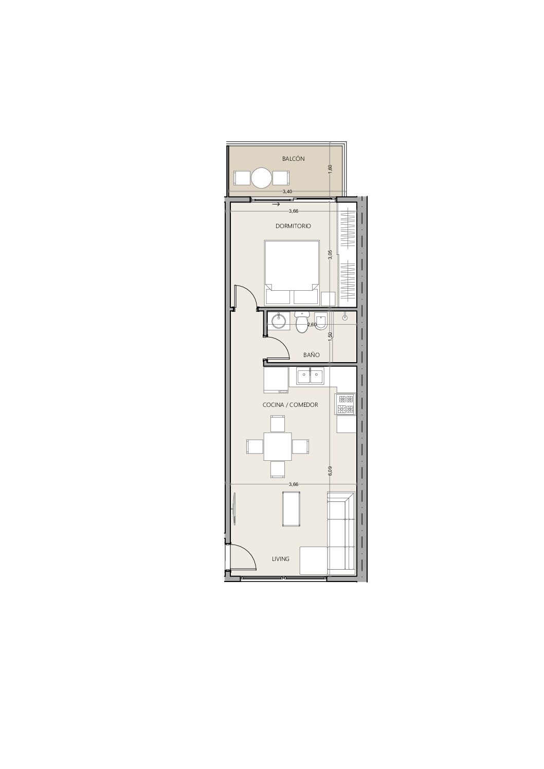 1 dormitorio en segundo piso con balcón al contrafrente, 1 dormitorio, cocina-living y comedor integrado, 1 baño completo.