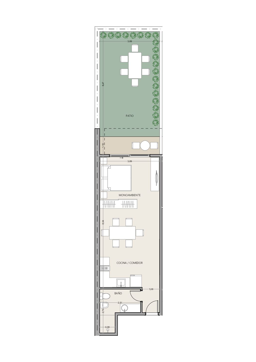 Monoambiente ubicado en PB, tiene 40,47m2 cubiertos y un patio exclusivo de 31,15m2. 71,62m2 totales