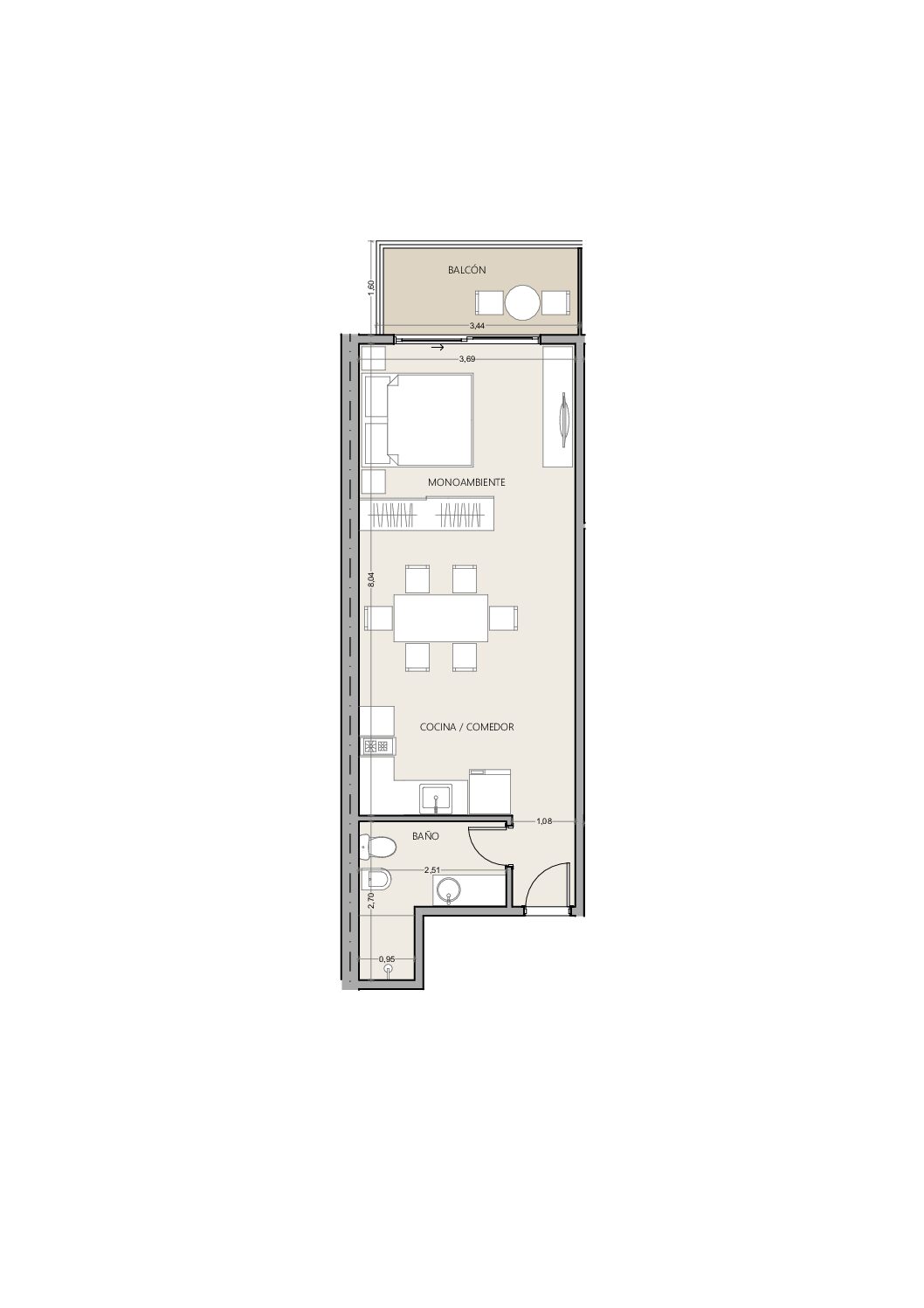 Monoambiente ubicado en 2° piso, tiene 40,52m2 cubiertos, balcón de 5,76m2 y 50,69m2 totales.
